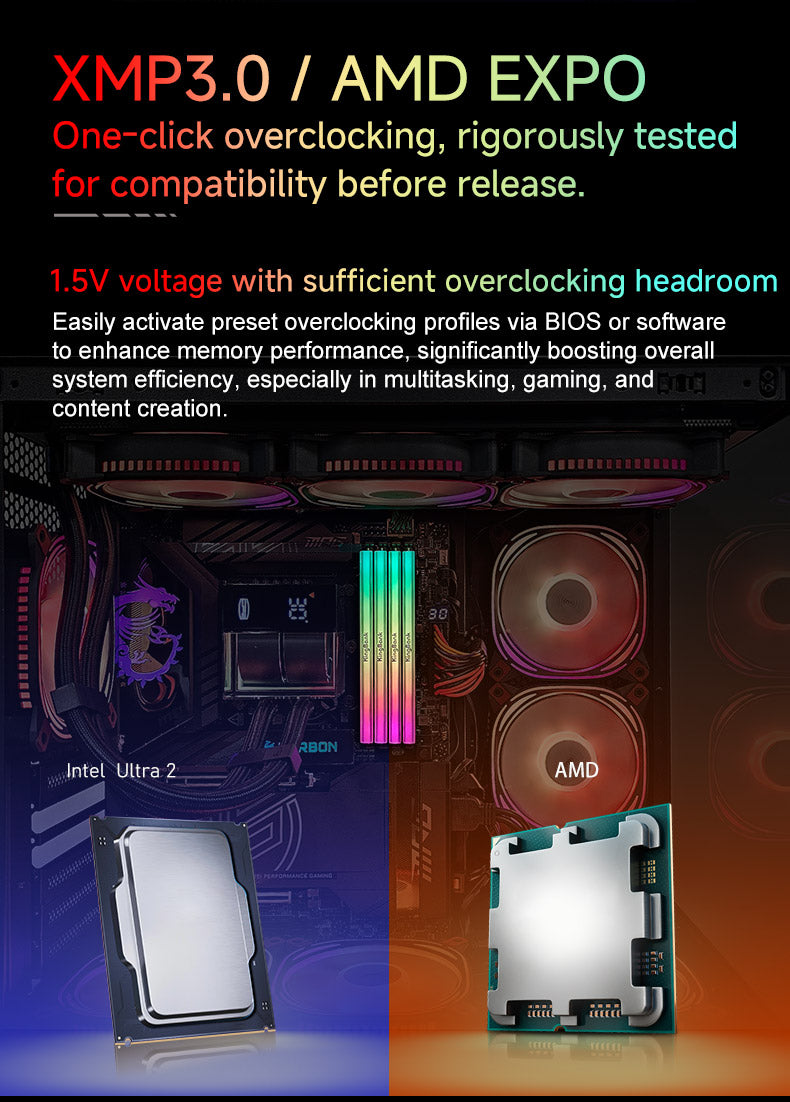- XMP 3.0 /EXPO Compatible with dual platforms, stable base frequency and great overclocking potential. It should be noted that generally, motherboards that support overclocking need to be inserted into card slots 2-4 to overclock to 6800MHZ.